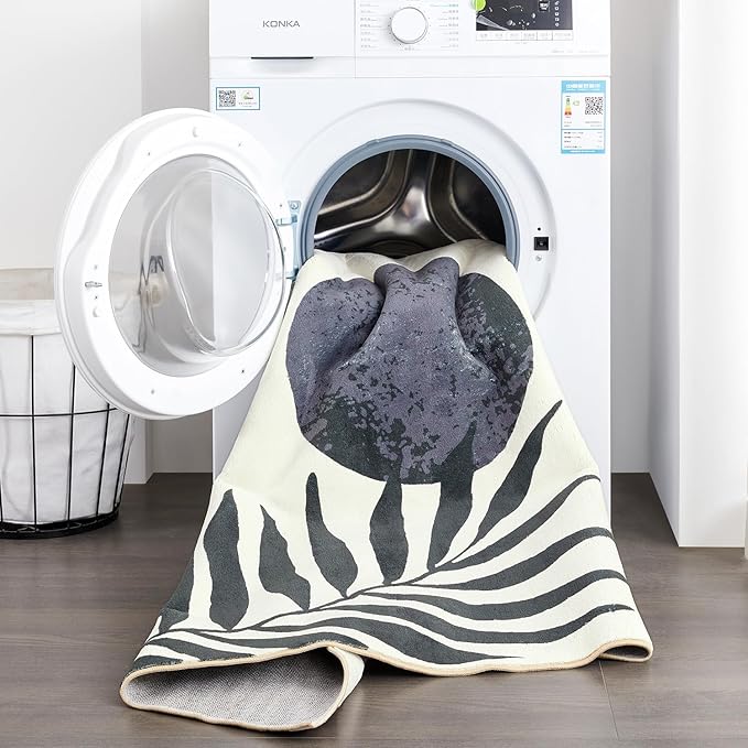 RoomTalks Mid Century Boho Washable 4x6 Rug, Black Vintage Cute Aesthetic Area Rugs Carpet for Kitchen Entryway Bedroom Living Room Office, Abstract Contemporary Botanical Leaves Thin Indoor Rug