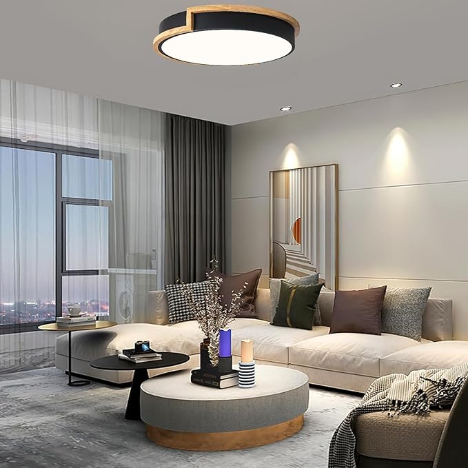 Dimmable Wood Flush Mount Ceiling Lights, Modern LED Black 5CCT 2700K-6000K Lighting Fixtures, Round Ceiling Lamp for Kitchen Living Room Dining Room Bedroom, 15.8in