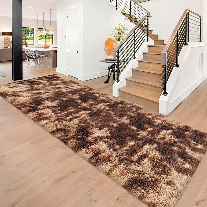 Super Soft Fluffy Living Room Area Rug 3x10 ft Tie-Dyed Brown Shaggy Furry Carpet Washable Non-Slip Floor Rugs Bedroom Bedside Nursery Rug Fuzzy Girls Boy Dorm Home Decor Aesthetic