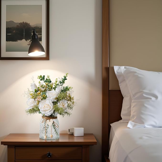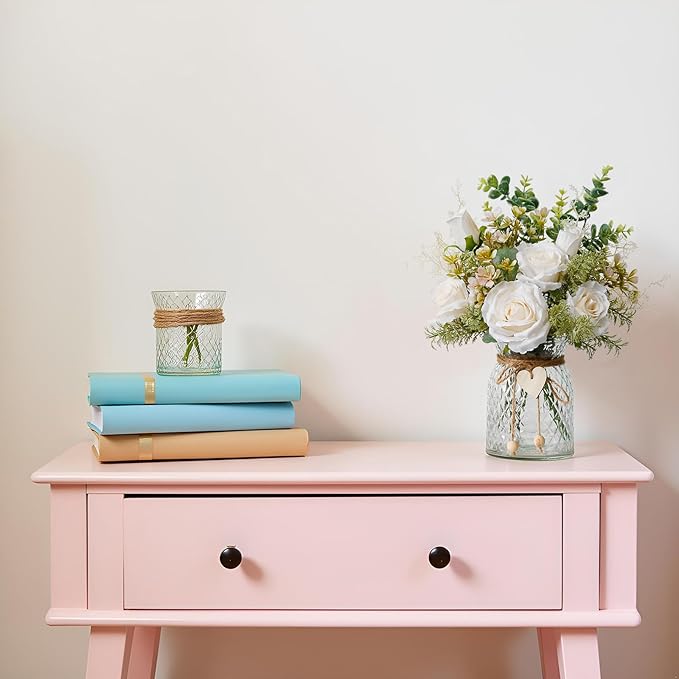 - LEFTOVER's Faux Flowers in Vase:Silk Flower Bouquet in Vase include 6 rose,eucalyptus stems and some decorative leaves,and a glass vase with a heart,ball pendant,twine,perfect for coffee table centerpiece and dining table centerpiece decor