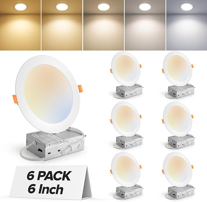 MAILCOS 6 Pack 6 Inch 5CCT Ultra-Thin LED Recessed Ceiling Light with Junction Box, 2700K-5000K Selectable, 1050LM High Brightness, Dimmable Canless Wafer Downlight, 12W 120V, ETL