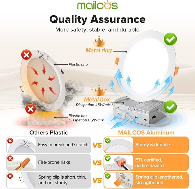 - Mailcos Strengths: Our whole light body is made of metal material and sprayed with wear-resistant white paint, the quality and safety of our lights are much higher than others made of plastic materials. And our led recessed lights enjoy 50000 hours life span. We provide 7*24h after-sales service. Contact us if any issue arises.