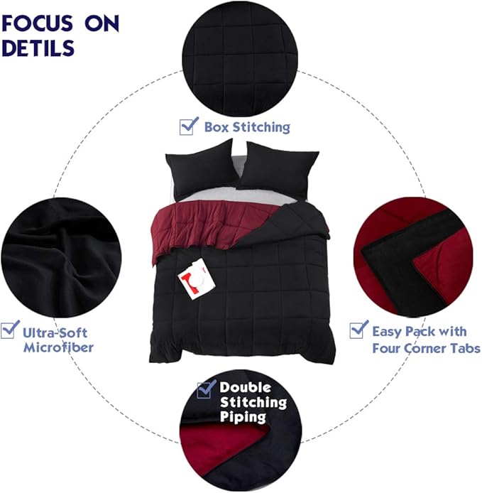 HIG 3 Pieces Black California King Comforter Set, Modern Breathable Box Stitched Duvet Insert with 2 Shams, Soft Fluffy All Season Reversible Comforter Set Blanket with Corner Tabs for Bedroom