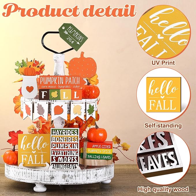 - Exquisite Fall Design: Brimming with autumnal charm, the bright fall tiered tray decor is nice designed to amplify the spirit of the fall season. This 19 piece set features beautiful, bright embellishments such as [hello fall], maple leaves, pumpkins wooden decor, and more. Its brown color wonderful accentuates the overall fall aesthetic, making it a standout addition to any decor