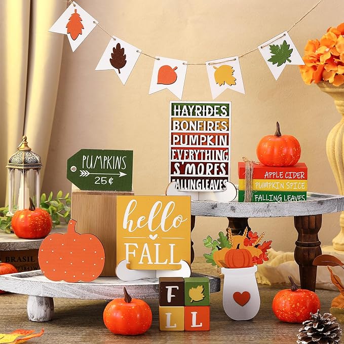 - Fall Decor Package Includes: Each package of bright fall tiered tray decor comes with 19 pieces, all carefully designed and crafted. These fall decor can well meet your needs of decorating your home, kitchen, or tiered tray, making a more beautiful decoration in your home in the rustic autumn style (tray is not included