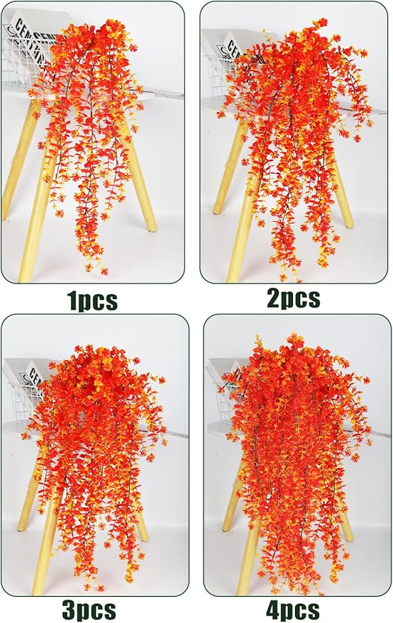 SJL Artificial Hanging Plants Pack of 4 Fall Faux Hanging Plants Artificial Decor Faux Eucalyptus Leaf Fake Autumn Plant Plastic Greenery Plant Flowers for Kitchen Bathroom Thanksgiving Decor(Gold)