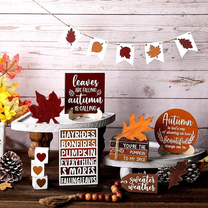 - Exquisite Fall Design: Brimming with autumnal charm, the retro fall tiered tray decor is nice designed to amplify the spirit of the fall season. This 19 piece set features beautiful, retro embellishments such as [leaves are Falling Autumn IS Calling], heart, maple leaves wooden decor, and more. Its brown color wonderful accentuates the overall fall aesthetic, making it a standout addition to any decor