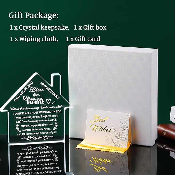 - Gift Package: Every housewarming gift comes with a beautifully packaged gift box, which includes: 1 x Crystal keepsake,1 x Gift box,1 x Gift card,1 x Wiping cloth