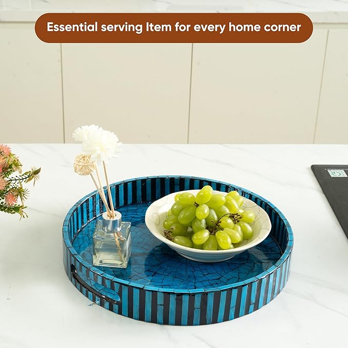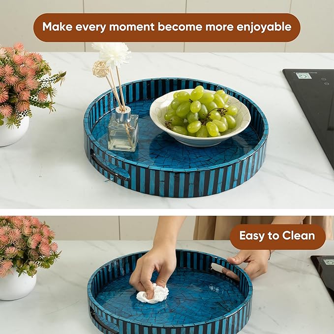 CLAYNIX Serving Tray 12.5 Inch, Lacquer Mother of Pearl Inlay Mosaic Tray, Round Wooden Marble Tray with Handles Trays for Tea, Breakfast (Dark Blue)
