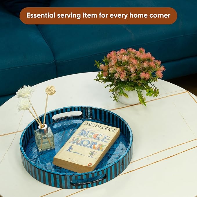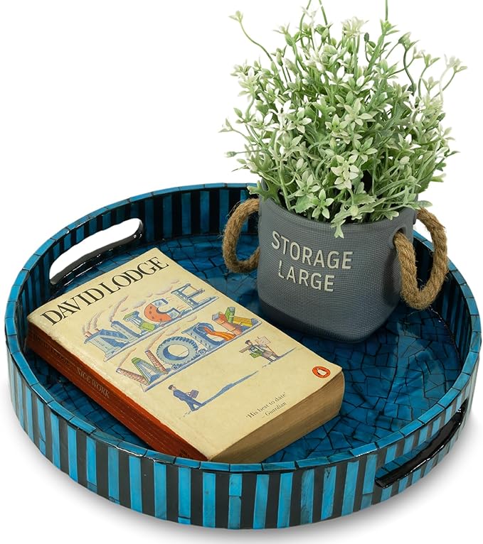 - Dark blue STYLISH FLORAL TRAYS with the great workmanship by Vietnamese artisans, flawlessly finished with strong wood core and blue floral pattern well-sorted MOTHER OF PEARL SHELLS inlayed on the surface creates an elegant handmade centerpiece to brighten your decoration, best matches any beach/coastal nauticaNew Home Gifts For Homel theme.