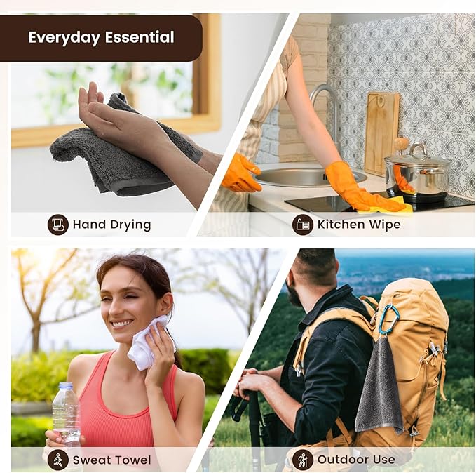 - Hanging Convenience — Every washcloth comes with a reinforced corner loop for secure hanging—no slipping, quicker air-drying, and tidier countertops