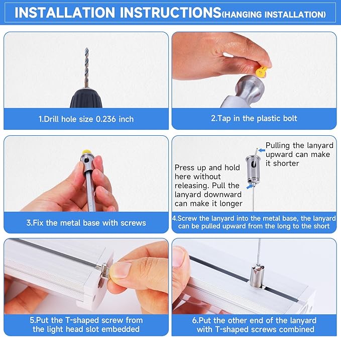 - Hanging or Surface Mount: With Hanging & Ceiling Clips. You can easily flush mount the 8ft shop light to install it or hang to ceiling. You are free to connect the power by providing a power cord or just hardwiring it. You are also free to connect the lights together by the ends or with the provided 2-end extension cord. The 8FT led light is widely used in garage, workbench, basement, workshop, warehouse, barn, office, library, etc