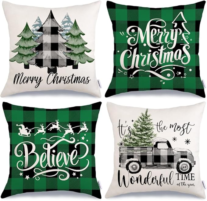 GEEORY Merry Christmas Throw Pillow Covers 20x20 Inch Set of 4, Xmas Trees Truck Green Buffalo Plaid Believe Farmhouse Decorative Cushion Cases for Home Decoration G595-20