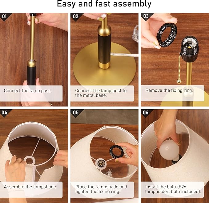 - { ECO-FRIENDLY MATERIAL TO PROTECT EYES - Wooden center column, solid metal round base, grid rubber non-slip pad is stable enough. Linen lampshade with split design, soft light, very easy to assemble