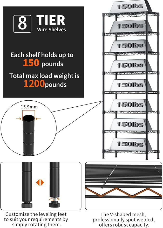 8 Tier Adjustable Storage Shelves Heavy Duty Metal Shelf Wire Shelving Unit Organizer Rack for Home Kitchen Office Pantry Room Bathroom Shelving Organizers and Storage Laundry