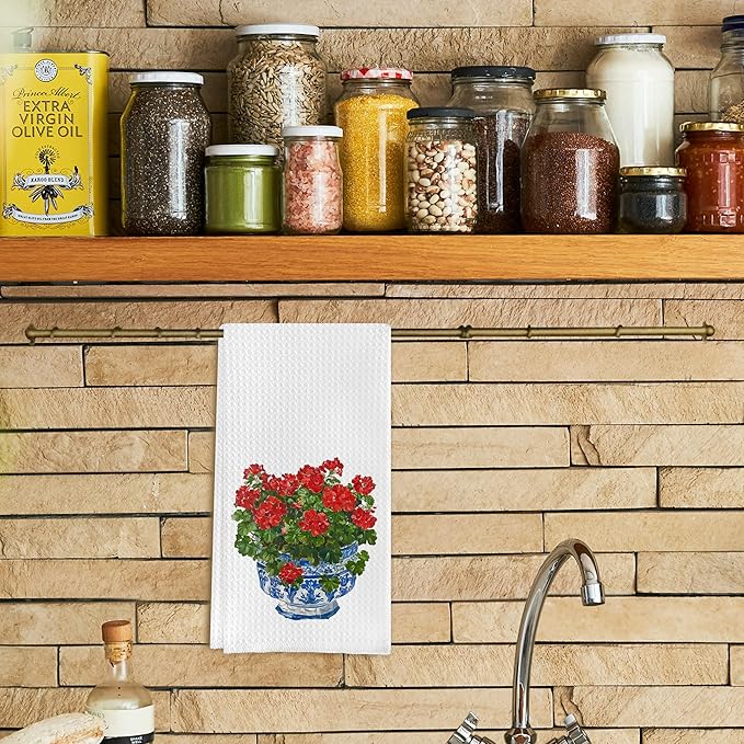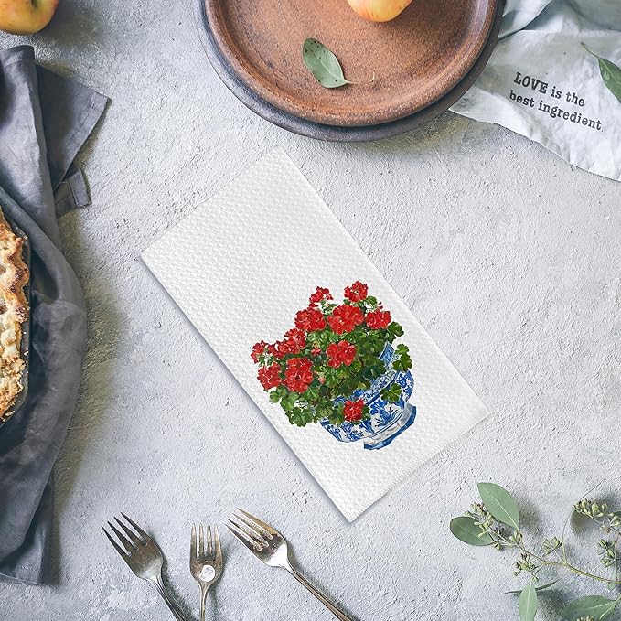 Chinoiserie Blue and White Geranium Porcelain Towels - Kitchen Dish & Bath Hand Towels (16x24 Inches, 8)