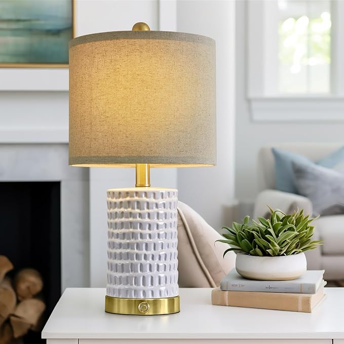 PORTRES 19" Farmhouse 3-Way Dimmable Touch Ceramic Table Lamp Set of 2 White Bedside Lamps for Bedroom Lamps for Living Room Nightstand Lamp End Table lamps with USB A+C Charging Ports(Bulbs Included)