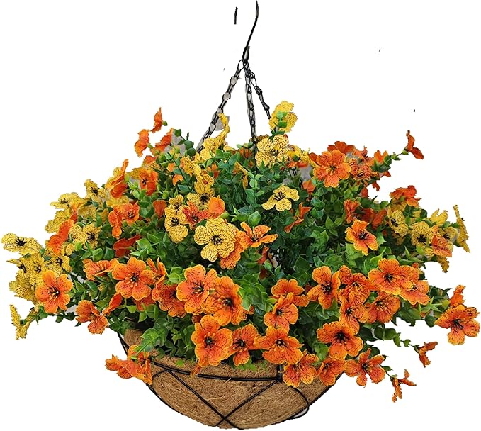 - NEAR-PERFECT: Crafted coconut palm baskets and high-quality artificial daisy flowers can beautify your corridors, balconies, study rooms, restaurants, AND NO MAINTENANCE, WILL NOT WITHER, BLOOM IN ALL SEASONS. The hanging plant basket is made of STURDY STEEL WITH A BLACK VINYL COATING FOR GOOD RUST PROTECTION.