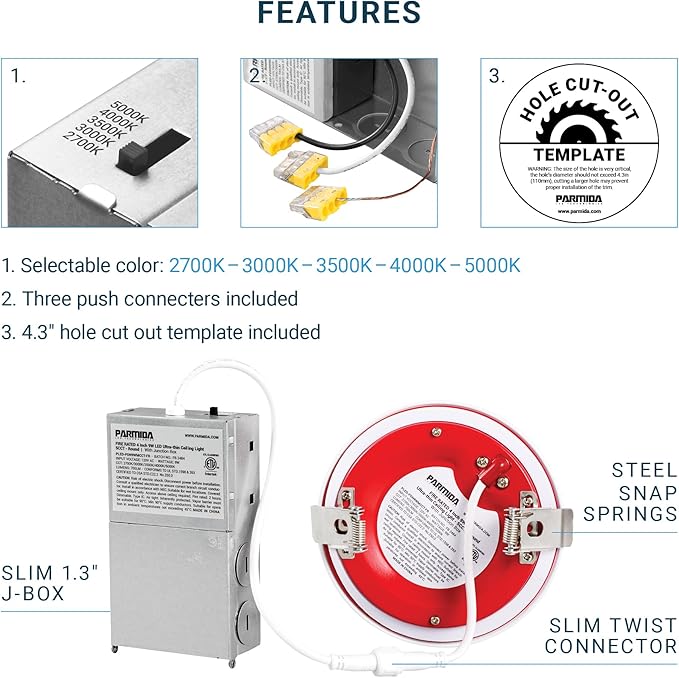 - 5 COLOR TEMPERATURE SWITCH & DIMMABLE: Set the color temperature of your lights to the desired level with a simple flip of a switch on the junction box. Choose between Warm White (2700K), Soft White (3000K), Neutral White (3500K), Cool White (4000K), and Day Light (5000K). 100-5% smooth dimming capability (please refer to compatible dimmer list). Compatible with most LED dimmers.