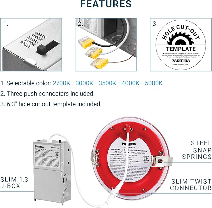 - 2-HOUR FIRE-RATED: The Parmida Slim Panel downlight provides clear, strong lighting while also being a safe, reliable light, ideal for your property. This light is made of certified heat-resistant materials, which provides a 2-hour fire rating, and eliminates the need for additional precautions, such as fire-rated housing. This rating is guaranteed by UL 263, ASTM E119, UL 1598, and CAN ULC S101 certifications.