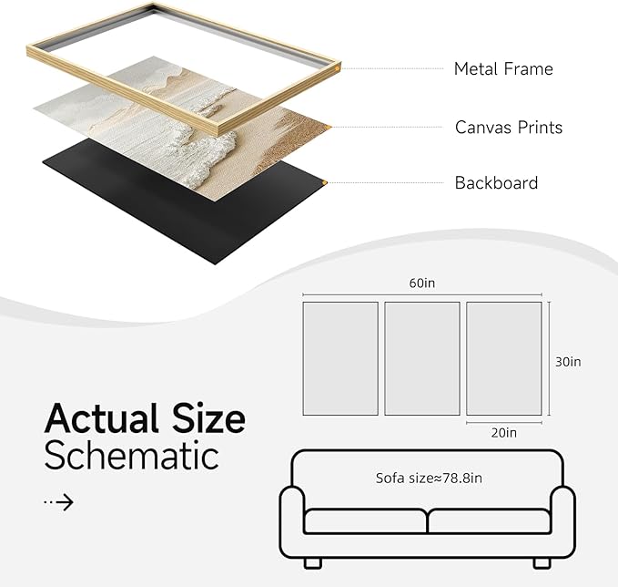 - [Framed Wall Art]: A set of 3 framed neutral coloured abstract beach wall paintings, each measuring 20x30 inches, the total size of the 3 together is 30x60 inches. The neutral-colored boho abstract beach pattern with sturdy frame is perfect for decorating living room wall.