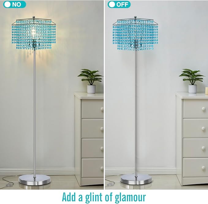 Luvkczc Crystal Floor Lamp Blue, 64" Tall Elegant Standing Lamp with On-Off Foot Switch, Double-Layer Lampshade, Light Blue Standing Lamps for Living Room, Bedroom, Office, 8W Bulb Included