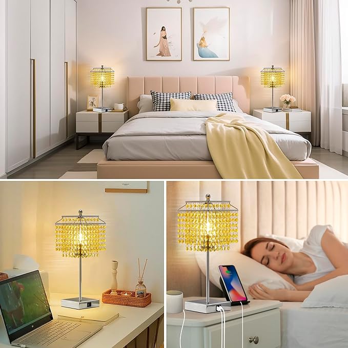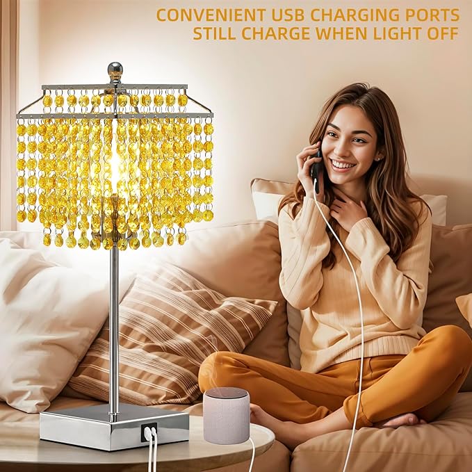 Crystal Table Lamp with Touch Control, Bedside Lamp with USB C+A Ports, 3-Way Dimmable with Crystal Shade for Girls Bedroom, Living Room, Light Yellow & B11 LED Bulb Included