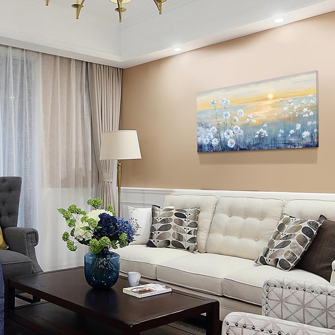 - Sunset Ocean Canvas Wall Art:Bring a bit of the coast to your home with this beach wall art.This ocean wall art features a seascape at sunset,the beautiful white wildflowers bloom along the beach,a shining gold sun setting over a calm sea with a stunning palette of blue,yellow,orange and gray.This abstract wall art will bring a touch of ocean serene style to your space