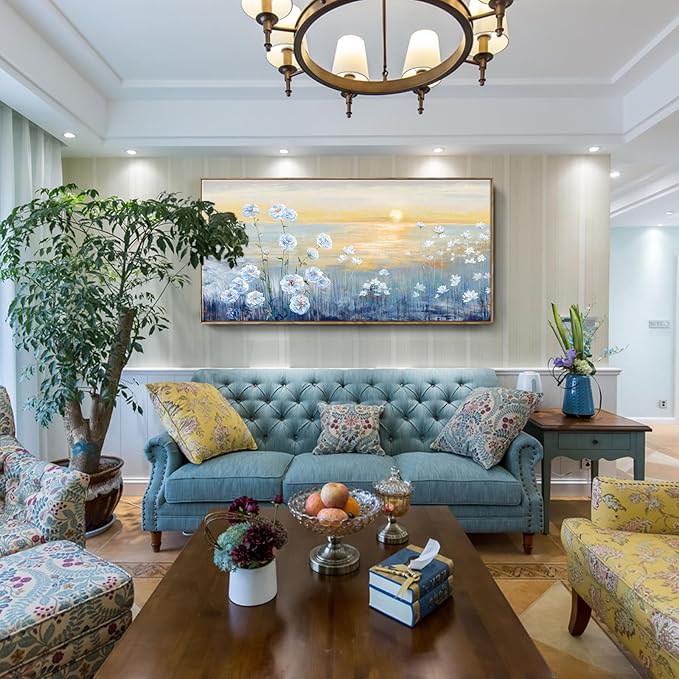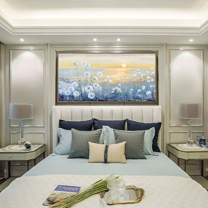 - Sunset Ocean Canvas Wall Art:Bring a bit of the coast to your home with this framed wall art.This beach wall art features a seascape at sunset,the beautiful white wildflowers bloom along the beach,a shining gold sun setting over a calm sea with a stunning palette of blue,yellow,orange and gray.This abstract wall art will bring a touch of ocean serene style to your space