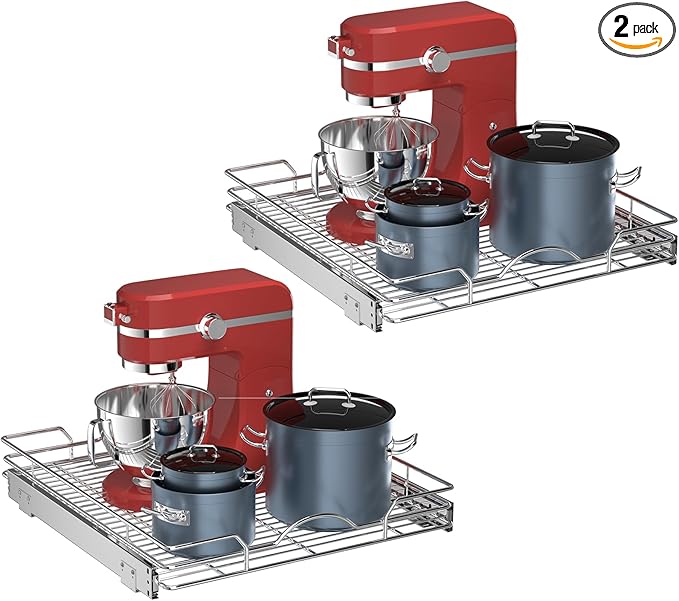 OCG Pull Out Cabinet Organizer 2 Pack (18" W x 21" D), Pull out Shelves 1 Tier, Cabinet Slide Out Shelves for Base Cabinet Organization in Kitchen Bathroom Pantry, Bottom Mount, Chrome Finish