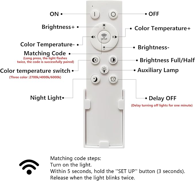- How to Make Remote Work: 1. Make the remote toward the ceiling light and turn on ceiling light, 2. Within 5 seconds, press middle "SETUP" button for 3-5 seconds; 3. Release button and see ceiling light flashed twice; 4. The matching code finished and remote worked