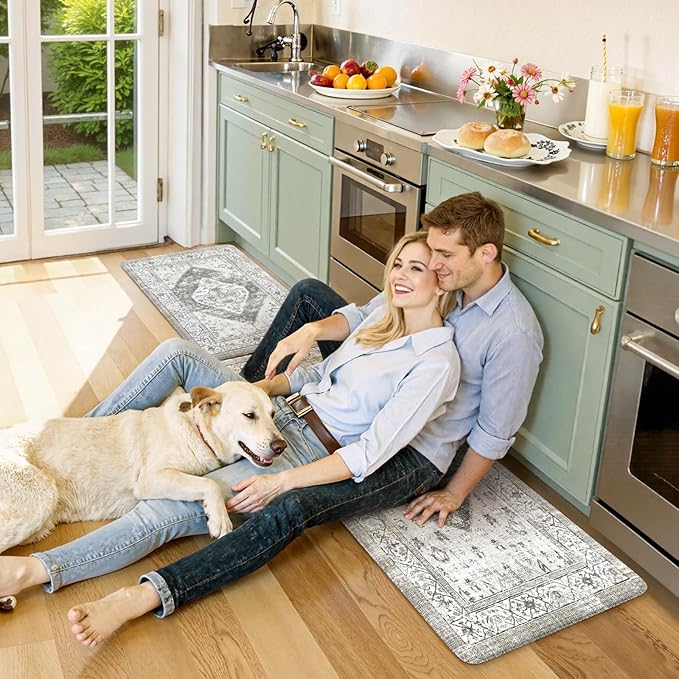 KIMODE Anti Fatigue Kitchen Mats, Boho Vintage Kitchen Rugs Sets of 2, Non Slip Waterproof Kitchen Floor Mats, Ergonomic Cushioned Standing Mats for Sink, Laundry, Desk Grey 20"x47"+20"x32"