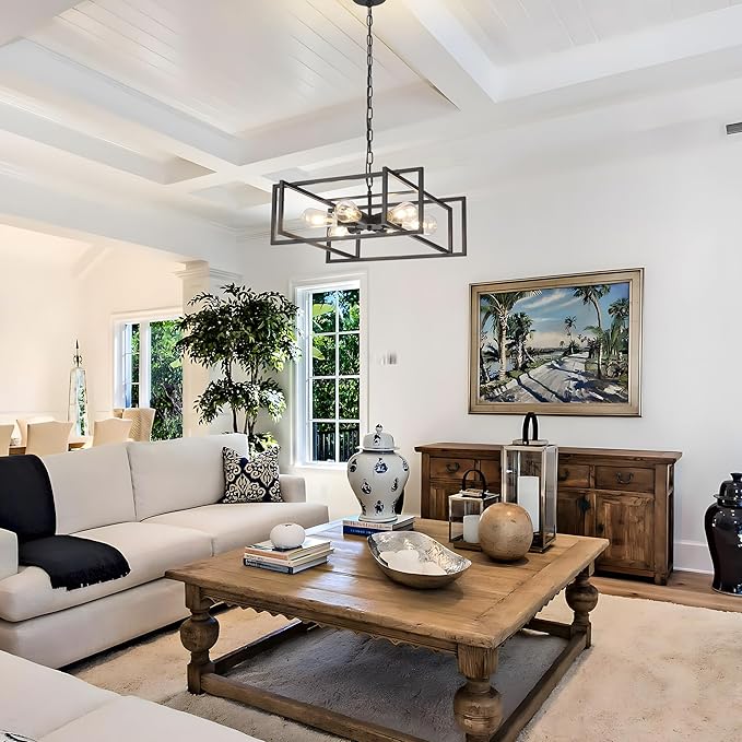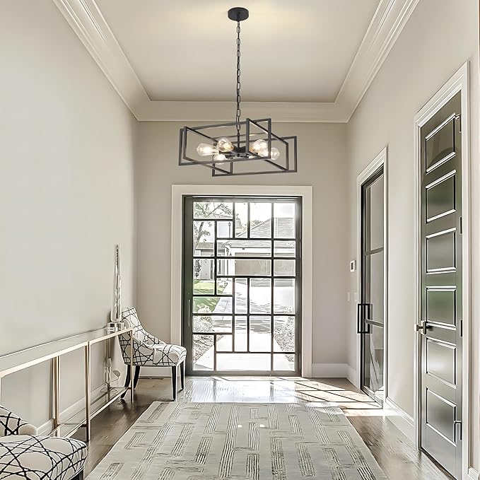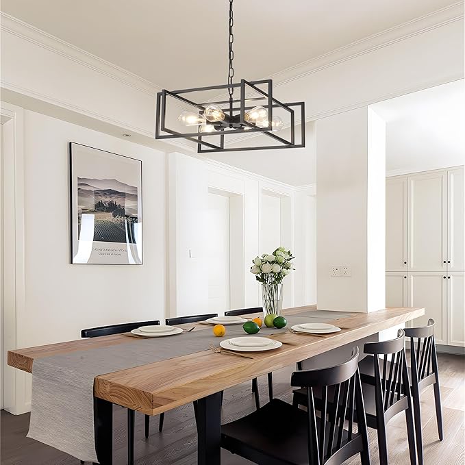 - Industrial Pendant Light: This large size pendant light has a black matte finish and is well made, which is not only beautiful, but also effective against rust and scratches. Featuring a unique and minimalist square design, it can illuminate your room through the hollowed out frame.