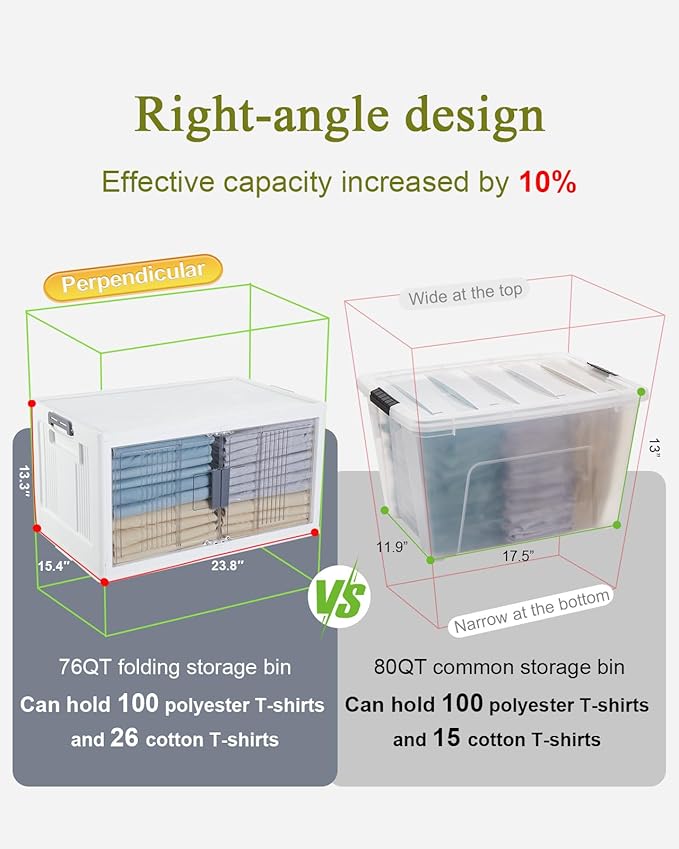 - Large Capacity: With dimensions of 23.8 inches (L) x 15.4 inches (W) x 13.3 inches (H) (2.17 inches when folded), these storage bins offer a spacious capacity of up to 76 quarts (19 gallons). They comfortably hold everyday items like cleaning supplies, snacks, office materials, and seasonal decorations. Their robust construction can support weights of up to 210 pounds (95KG) of weight, making them suitable for heavier items like books and tools