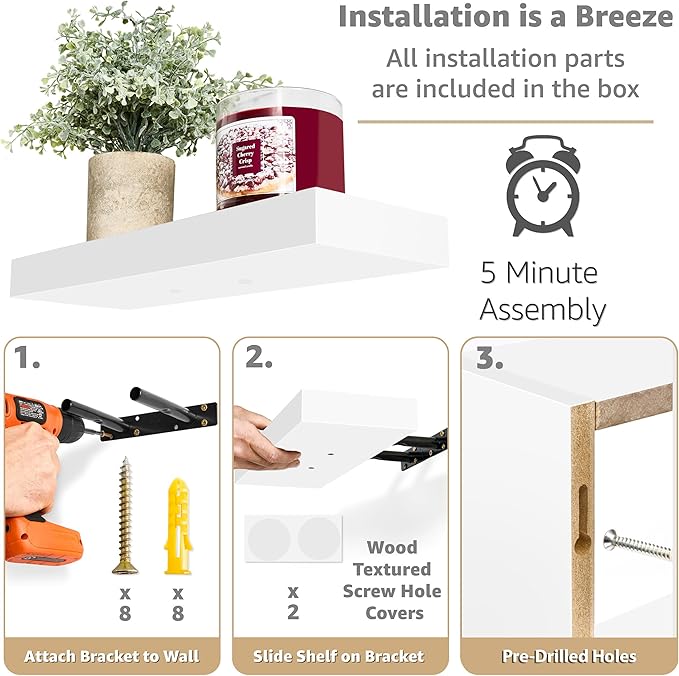 - Easy Installation: Floating wood shelves are designed for easy installation. Hanging hardware is included. Flat shelves measure 16” X 5.5” X 1.5” Box shelf measures 16” X 5.5” X 7.75”