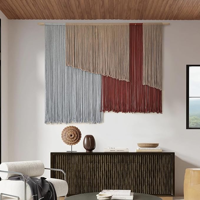 - 【Chic Wall Art】: Macrame wall hanging boho art grayuses a softer light gray or dark gray to create a stable tone, while the red part uses dark red or burgundy to increase the visual enthusiasm and vitality.