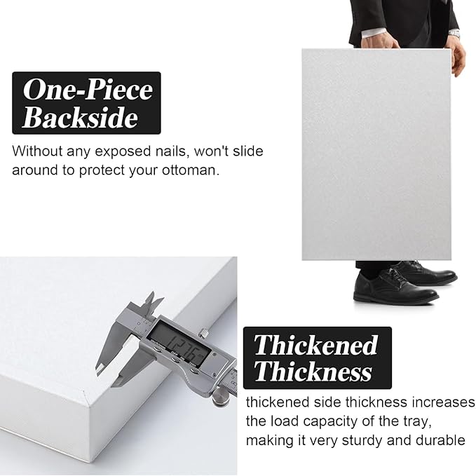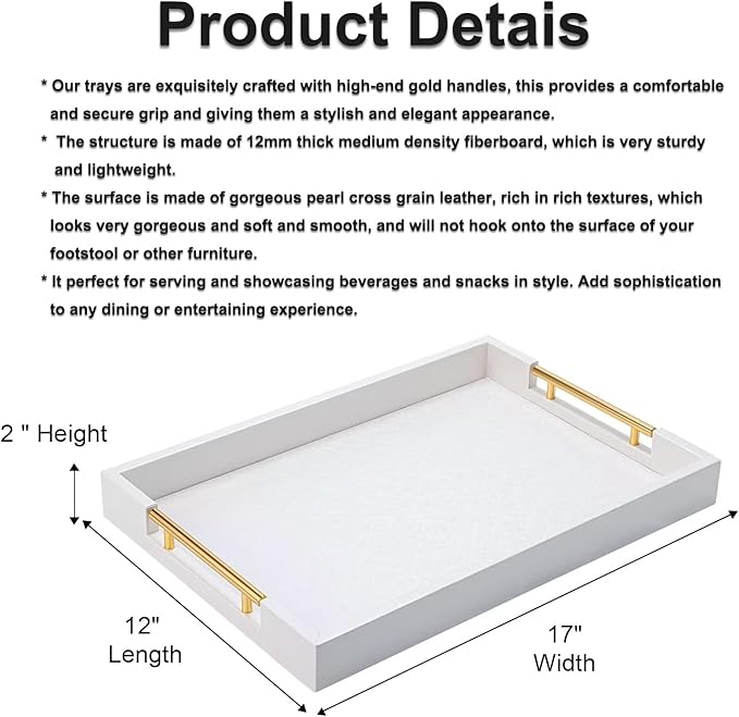 - Durable Leather Tray: Our trays are exquisitely crafted with high-end gold handles,The structure is made of 12mm thick medium density fiberboard, which is very sturdy and lightweight.The surface is made of gorgeous pearl cross grain leather, rich in rich textures, which looks very gorgeous and soft and smooth, and will not hook onto the surface of your footstool or other furniture.