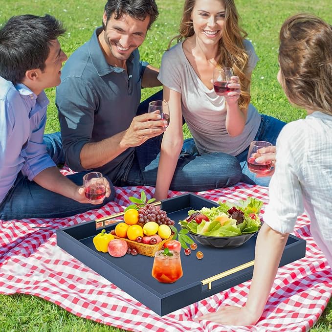 Navy Blue Faux Leather Decorative Tray,Large Square Serving Tray with Handles,coffee table tray for Home decor,Large Ottoman Tray for Living Room,Bathroom, 20 x 20in