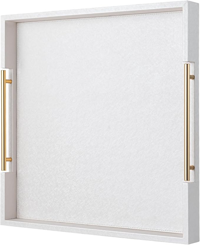 White Leather Large Ottoman Tray for Living Room,Stylish Square Decorative Tray for Coffee Table,Versatile Serving Trays with Handles for Party