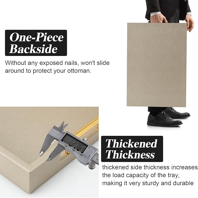 - Durable Leather Tray: Our trays are exquisitely crafted with high-end gold handles,The structure is made of 12mm thick medium density fiberboard, which is very sturdy and lightweight.The surface is made of gorgeous pearl cross grain leather, rich in rich textures, which looks very gorgeous and soft and smooth, and will not hook onto the surface of your footstool or other furniture.