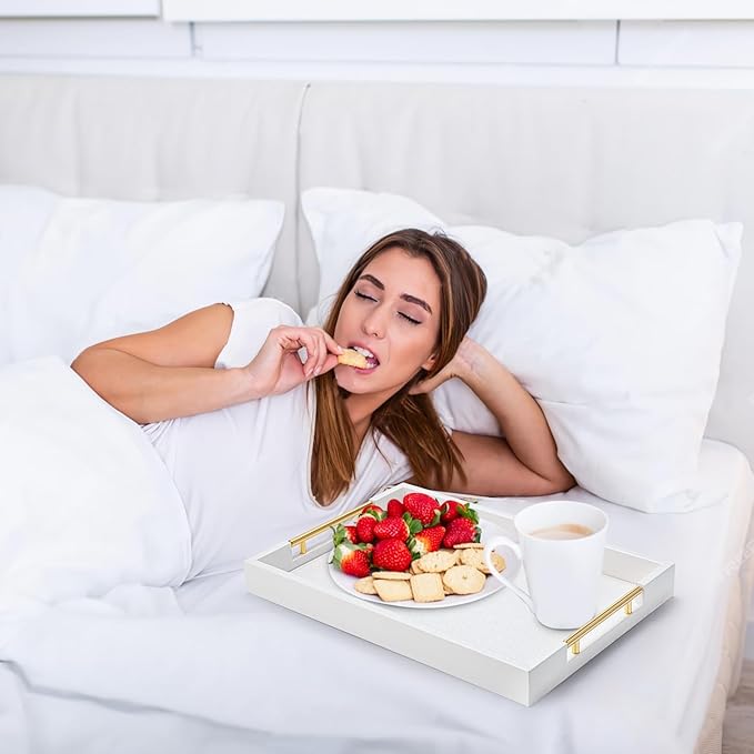 White Leather Decotative Coffee Table Tray,Modern Large Ottoman Tray Rectangle Serving Tray with Handles for Living Room Party