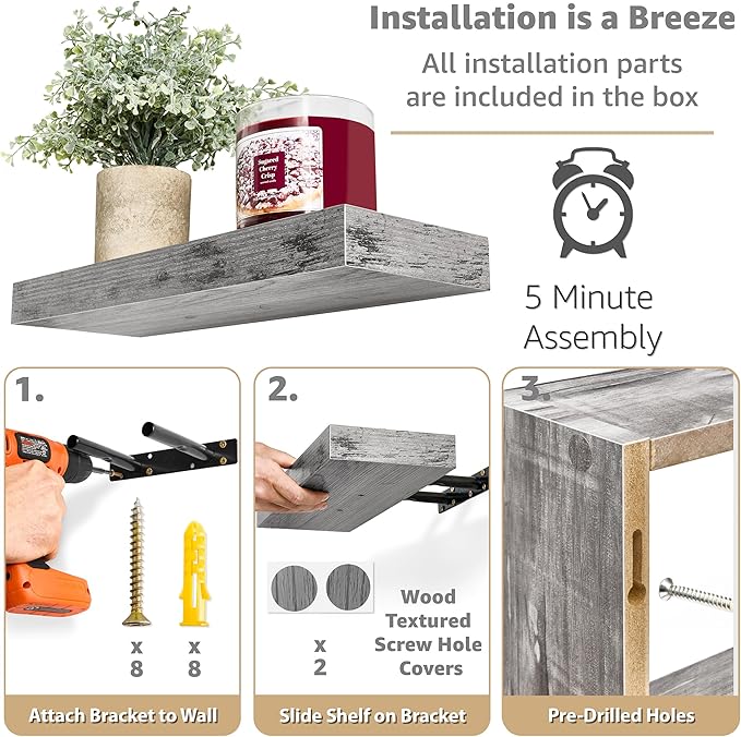- Easy Installation: Floating wood shelves are designed for easy installation. Hanging hardware is included. Flat shelves measure 16” X 5.5” X 1.5” Box shelf measures 16” X 5.5” X 7.75”