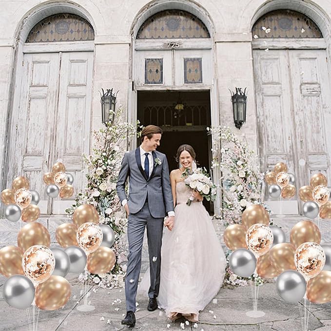 - WHAT INLCUDE: This balloon stand kit include 4 set balloon holders, 36 pcs balloons - champagne and silver balloons, rose gold confetti balloons, 1 pc balloon pump, 2 pcs balloon clips, 2 rolls ribbons, 1 pcs glue dots and 1 pc tie tool