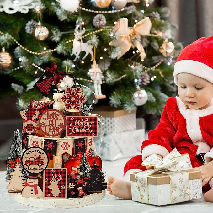 17 Pcs Christmas Tiered Tray Decor Set Winter Tiered Tray Decorations Farmhouse Tabletop Centerpiece Christmas Wooden 3D Sign for Xmas Home Buffalo Plaid Rustic Table Decoration(Retro)