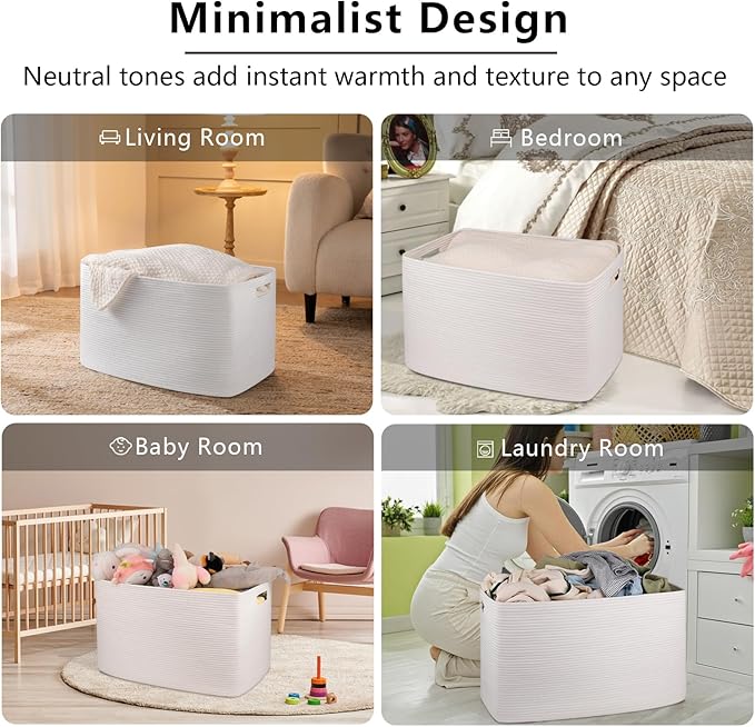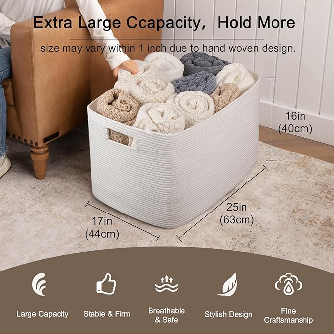OIAHOMY 118L XXXLarge Cotton Rope Storage Basket, Oversized Blanket Basket, Used for Organizing Dirty Clothes in Living Room, Bedroom, Nursery, Dog Toy Storage Bins, 25" x 17" x 16",White