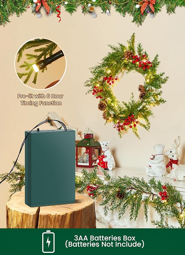 - Battery Powered and Timer Function: The prelit garland twinkle lights powered by a 3AA battery box (batteries not included), no outlet required. The timer function automatically activates when the battery operated christmas lights are turned on, staying on for 6 hours and off for 18 hours daily for create a charming festive atmosphere