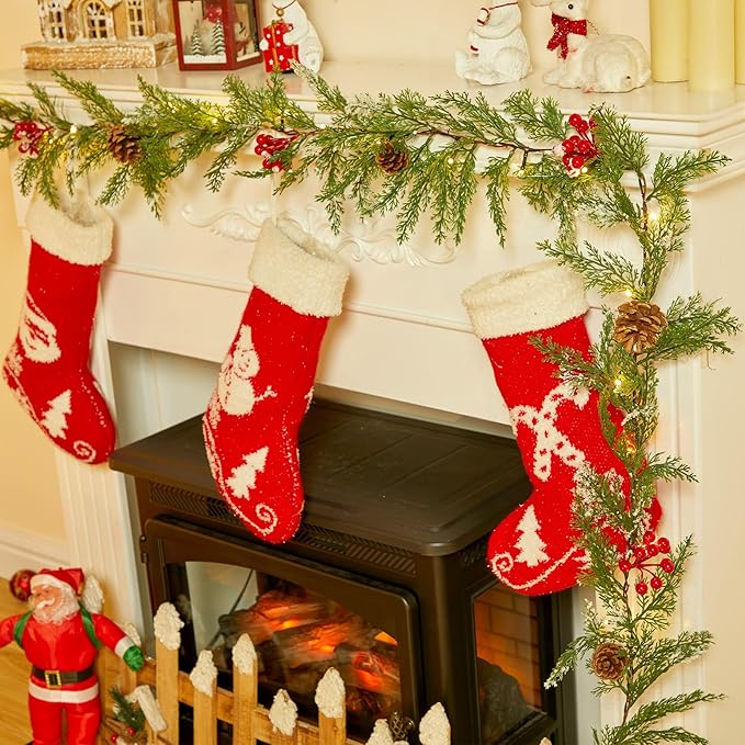 - Set of 2 Realistic Christmas Garland Decorations: Each 6 foot outdoor garland with lights are crafted with 77 artificial cypress Leaves branches(some branch tips are dusted with white snow flock), 4 red berries, and 4 natural pinecones, adding a magical winter touch to your holiday decorations. You can also DIY them with additional accessories to brighten up your Christmas, Thanksgiving and all of festive celebrations
