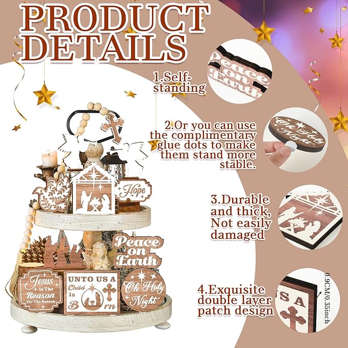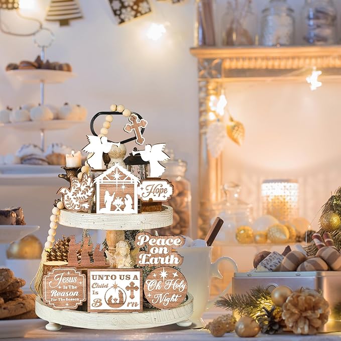 - Package Includes: you will get 17 pieces of Christmas wooden tray decor in total; The variety in designs is suitable to satisfy your Christmas embellishment needs; Moreover, you will get receive 1 thin hemp rope, 1 glue, 1 webbing and 4 wooden stands that you need for a quantity Christmas atmosphere in your everyday life.Please note that the product does not include a tiered tray