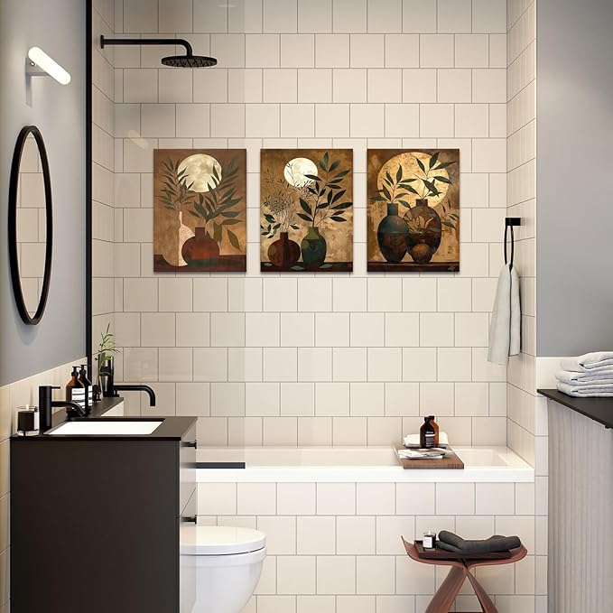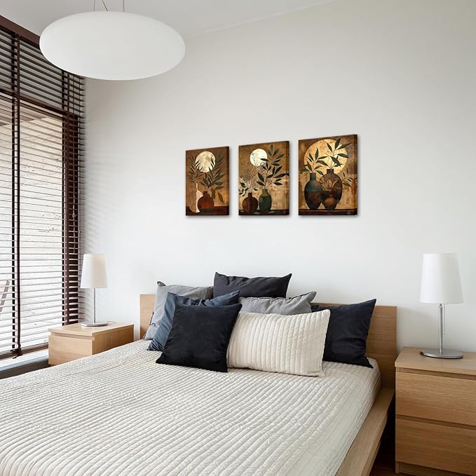 ChaudArt 3 Pieces Green Branch in Brown Vase with Moon Decor Paintings Modern Canvas Wall Art Decor Artworks Pictures for Living Room Bedroom Kitchen Decoration