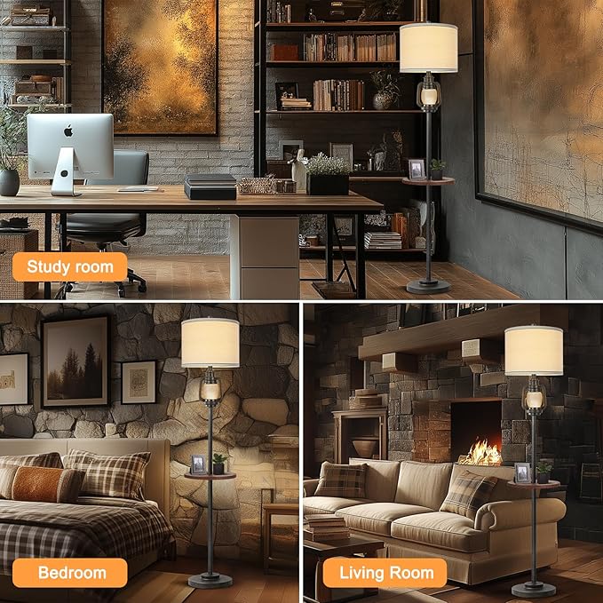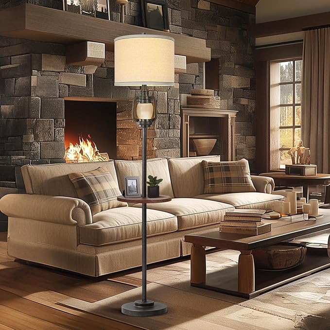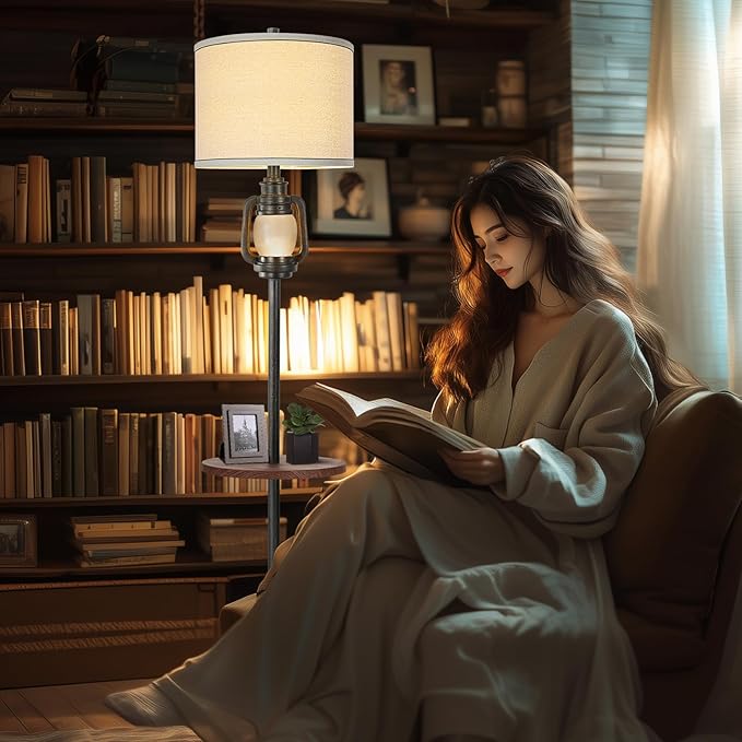 - FLOOR LAMP WITH TRAY: This farmhouse floor lamp comes in with a metal tray and you can use it as a table by your couch or put it by your bed as a nightstand. The tray is sturdy and fixed which allows you to put your phones, cups or any other thing safely.